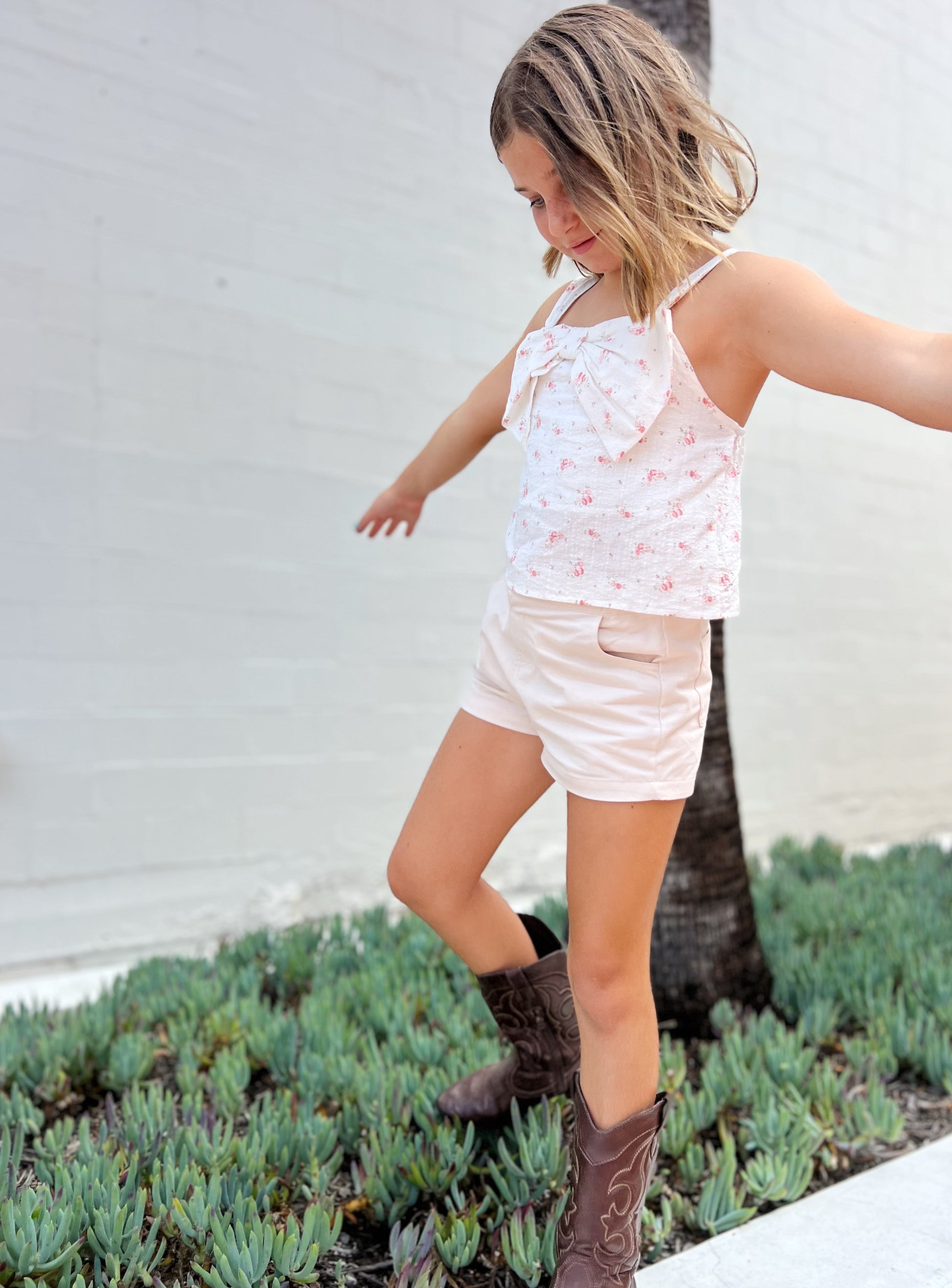 Add a touch to your child's wardrobe with our sleeveless, woven floral cotton top. Perfect for any occasion, this bow front top will have your child looking stylish and feeling comfortable all day.